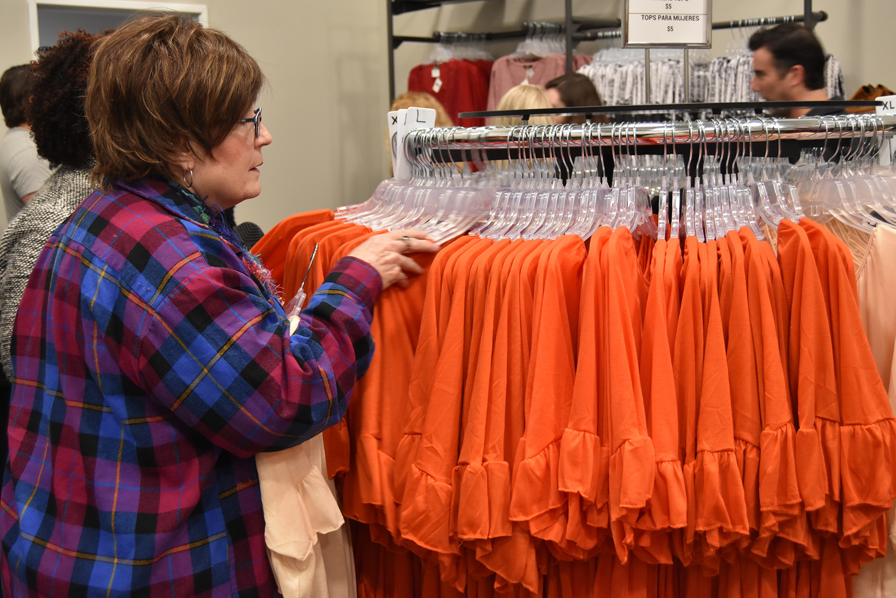 Our inventory varies, but typically you'll find a large selection of either brand new, or gently used clothing. Plus, we often stock a variety of smaller household goods.
